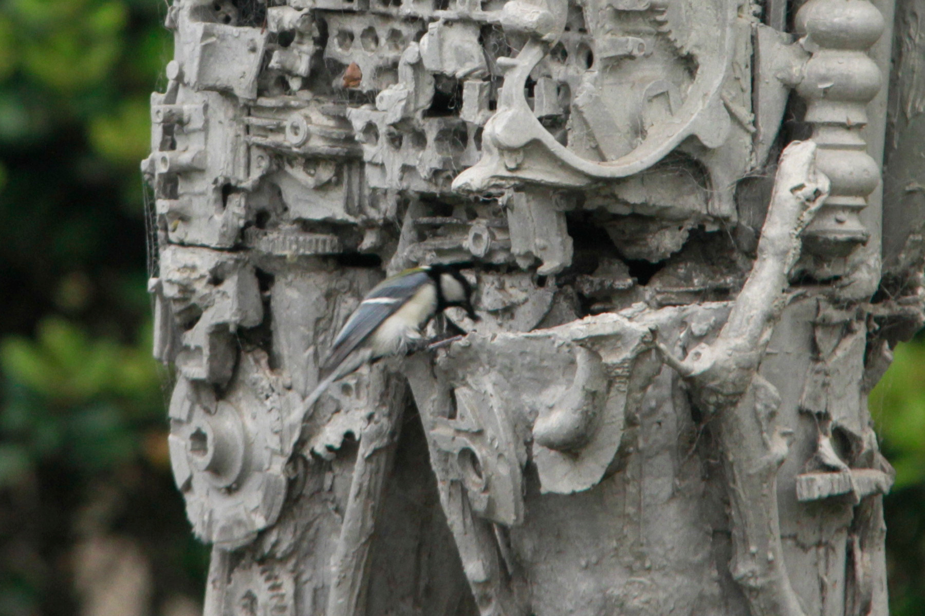 さらにこのオブジェの撮影時、オブジェの左股関節部分の隙間には、野鳥のシジュウカラが巣を作っていました。