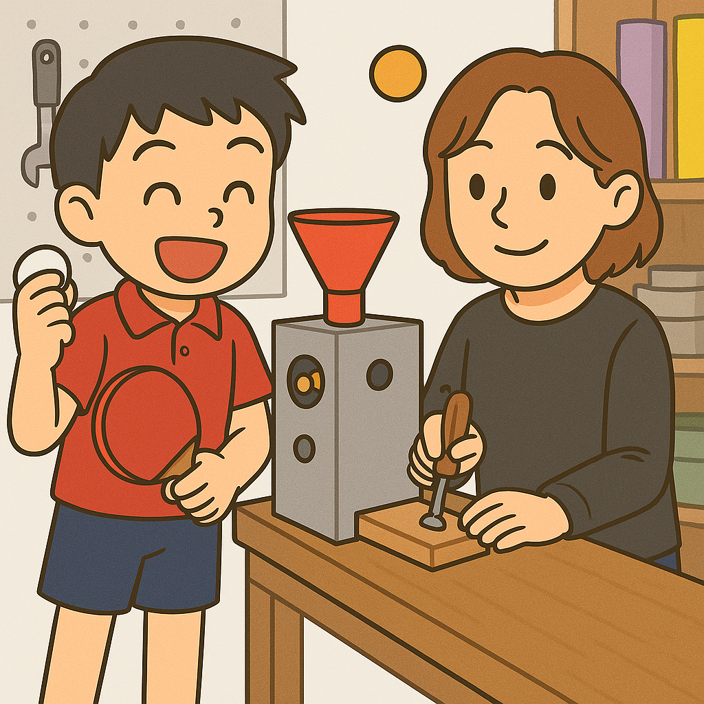 部活動の練習だけではなかなか上達しない、でも試合で勝ちたい。そこで、自主練習のためにピンポン玉が自動で出てくる練習用マシーンが欲しくなったそうなんです。とはいえ高価で買えない・・・。