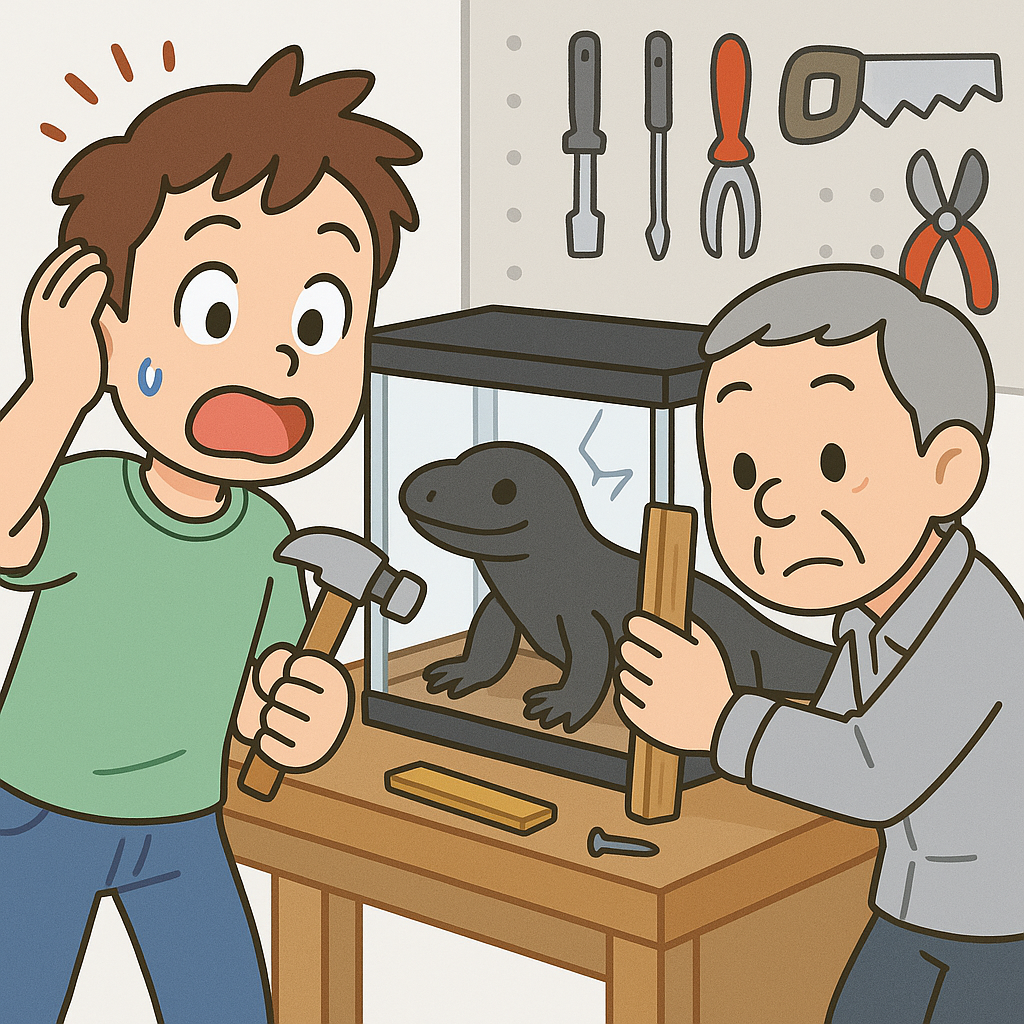 このままでは窓ガラスを割って逃げ出してしまうかもしれないとのことで、大急ぎで工作室にある材料を使ってケージ修理をしたことがありました。
