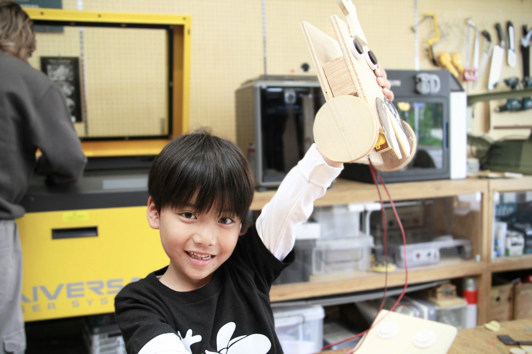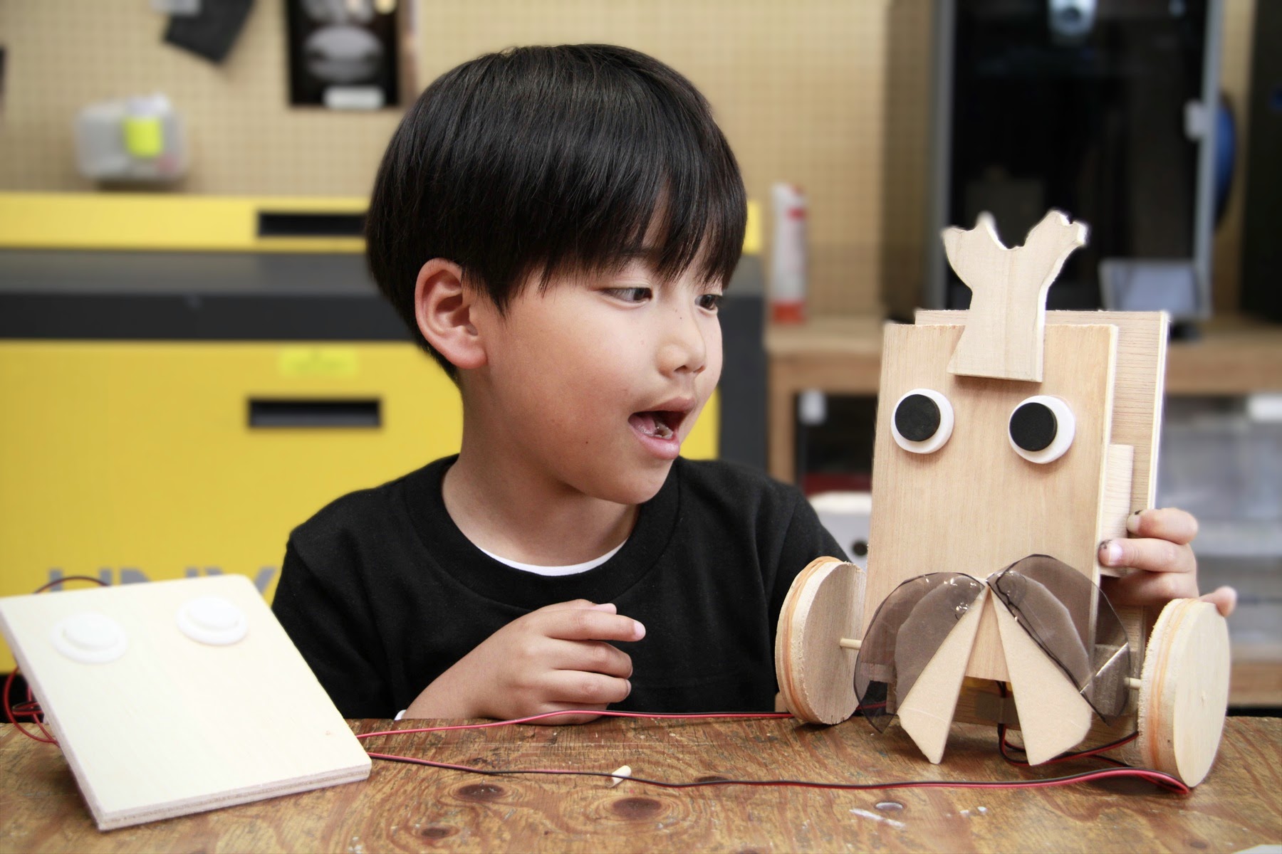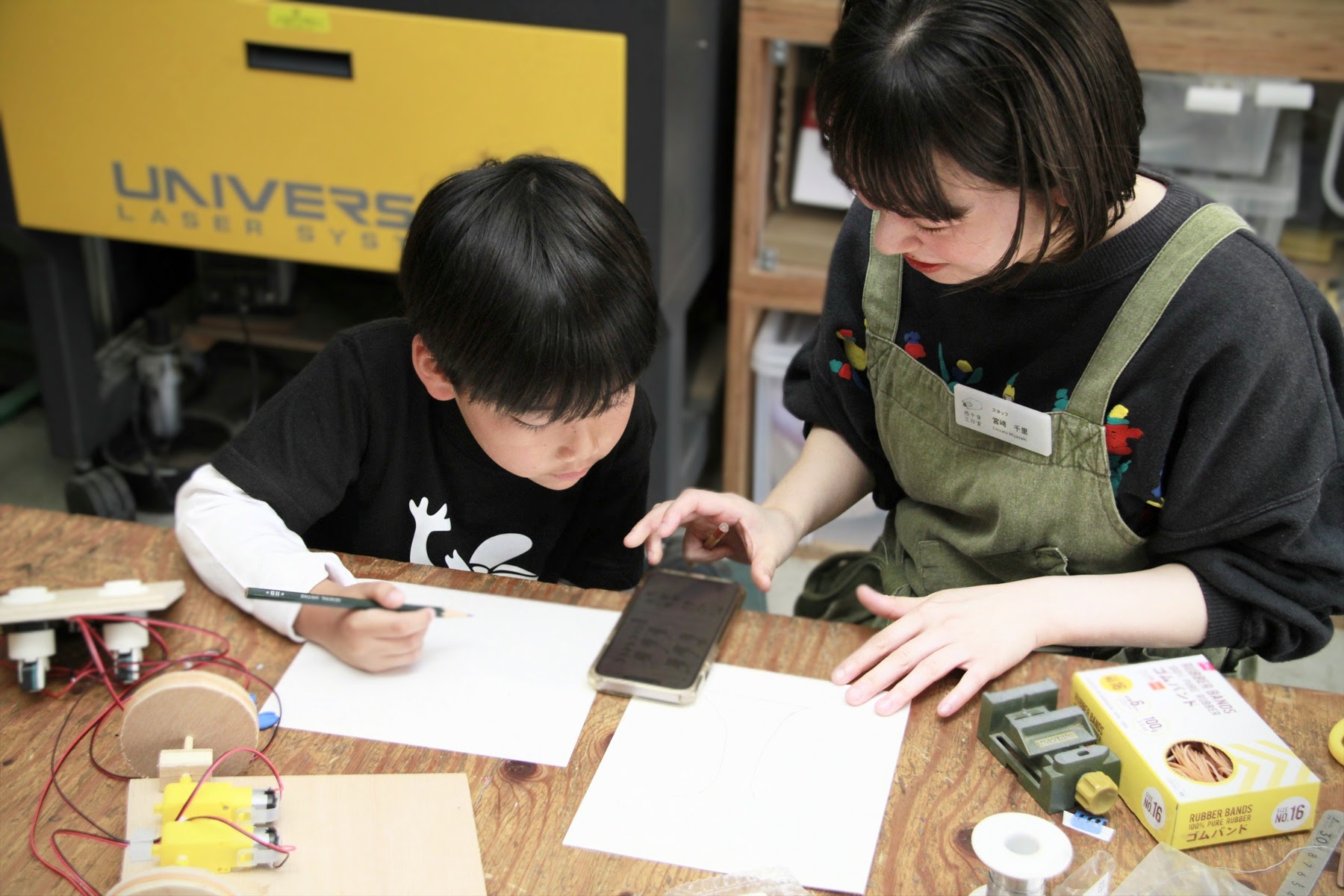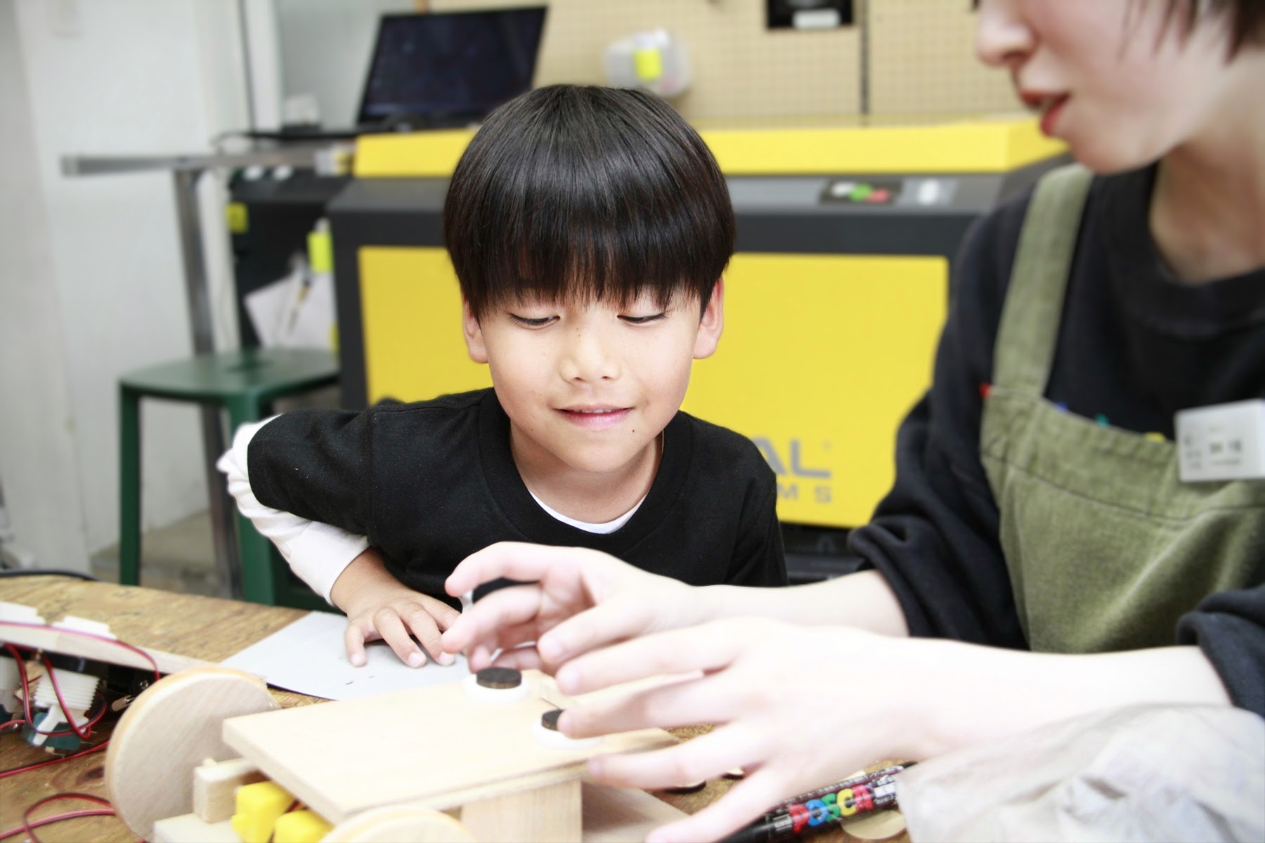 少年の方は、電子工作部分が完成。ここからはスタッフの宮﨑さんが、カブトムシの見た目に近づけるため、装飾として木工をサポートしてくれました。