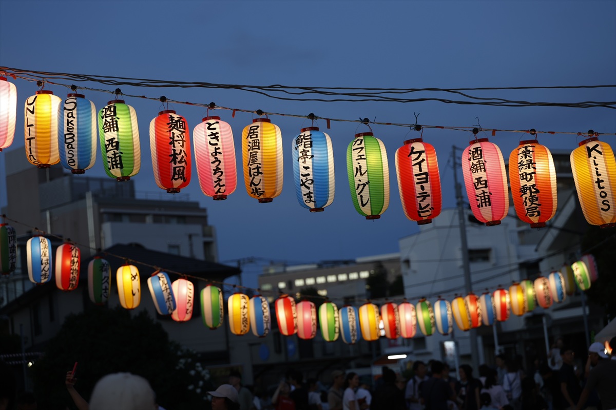 子どもから大人、おじいちゃんおばあちゃんまで、世代関係なく音楽に合わせて踊り、手を叩きます。櫓に吊られた提灯には、地元店舗や個人の名前が並びます。